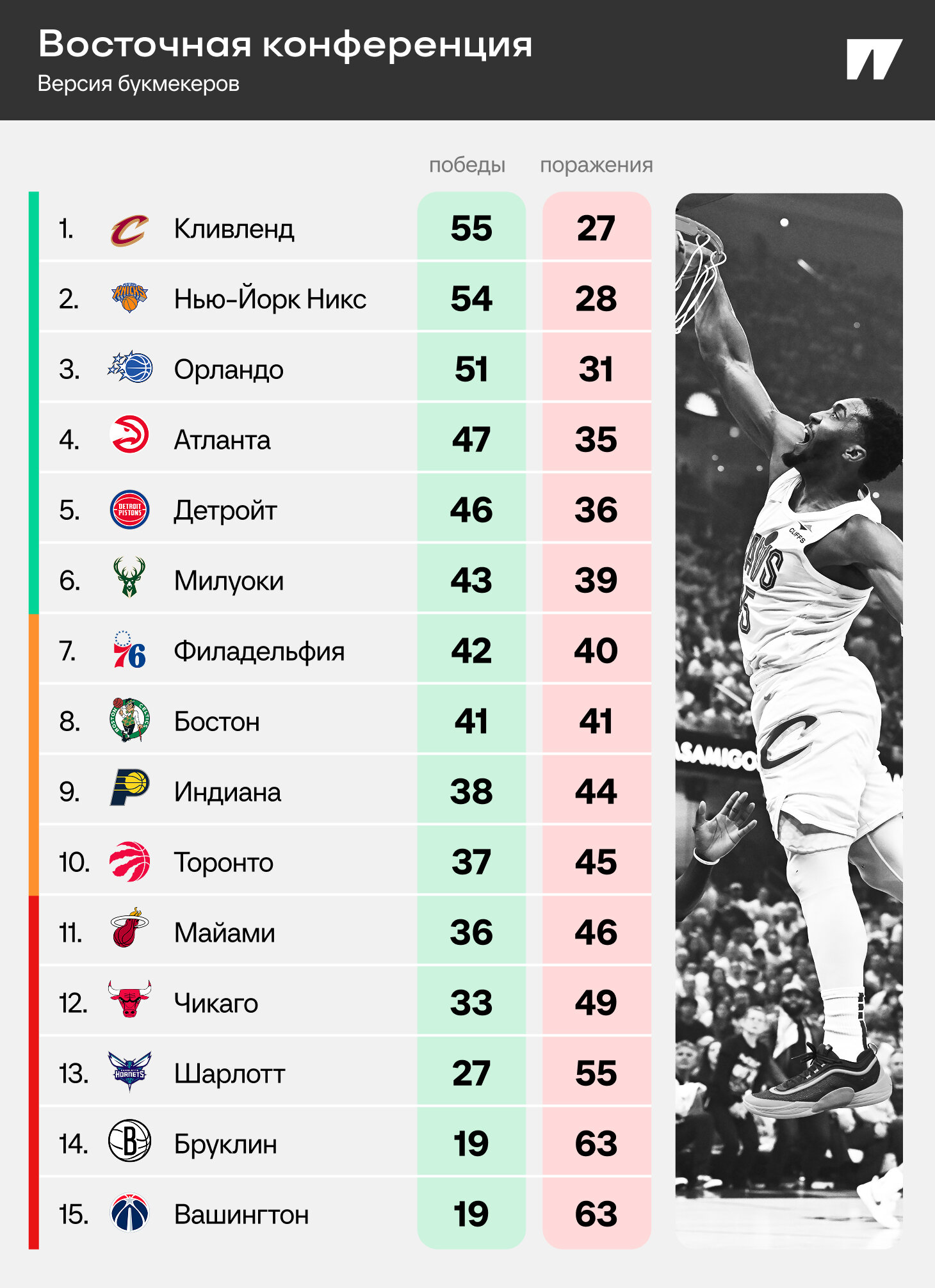 В прошлом сезоне сразу три команды оформили больше 60 побед: «Оклахома», «Кливленд» и «Бостон». Перед стартом новой регулярки прогноз у аналитиков осторожнее – нет сомнений только по стабильности чемпиона. Остальные до 60 побед не доберутся.