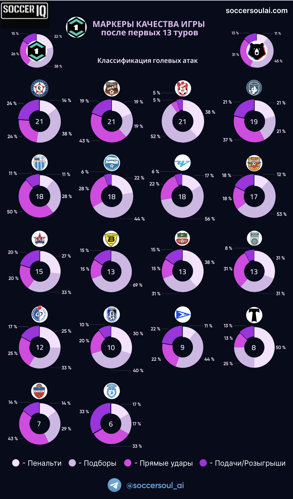 Принципиальная разница между реализованными стандартами Первой лиги и РПЛ заключается в доле мячей, забиваемых с пенальти - 26% и 40%, соответственно. Возможно, причиной тому - лишь локальное введение VAR-системы, старательно помогающей увидеть не самые очевидные нарушения. Таким образом, разница приличная, отсюда и вытекающее преимущество Первой лиги по долям голов других типов: с подборов, после прямых ударов и розыгрышей мяча.