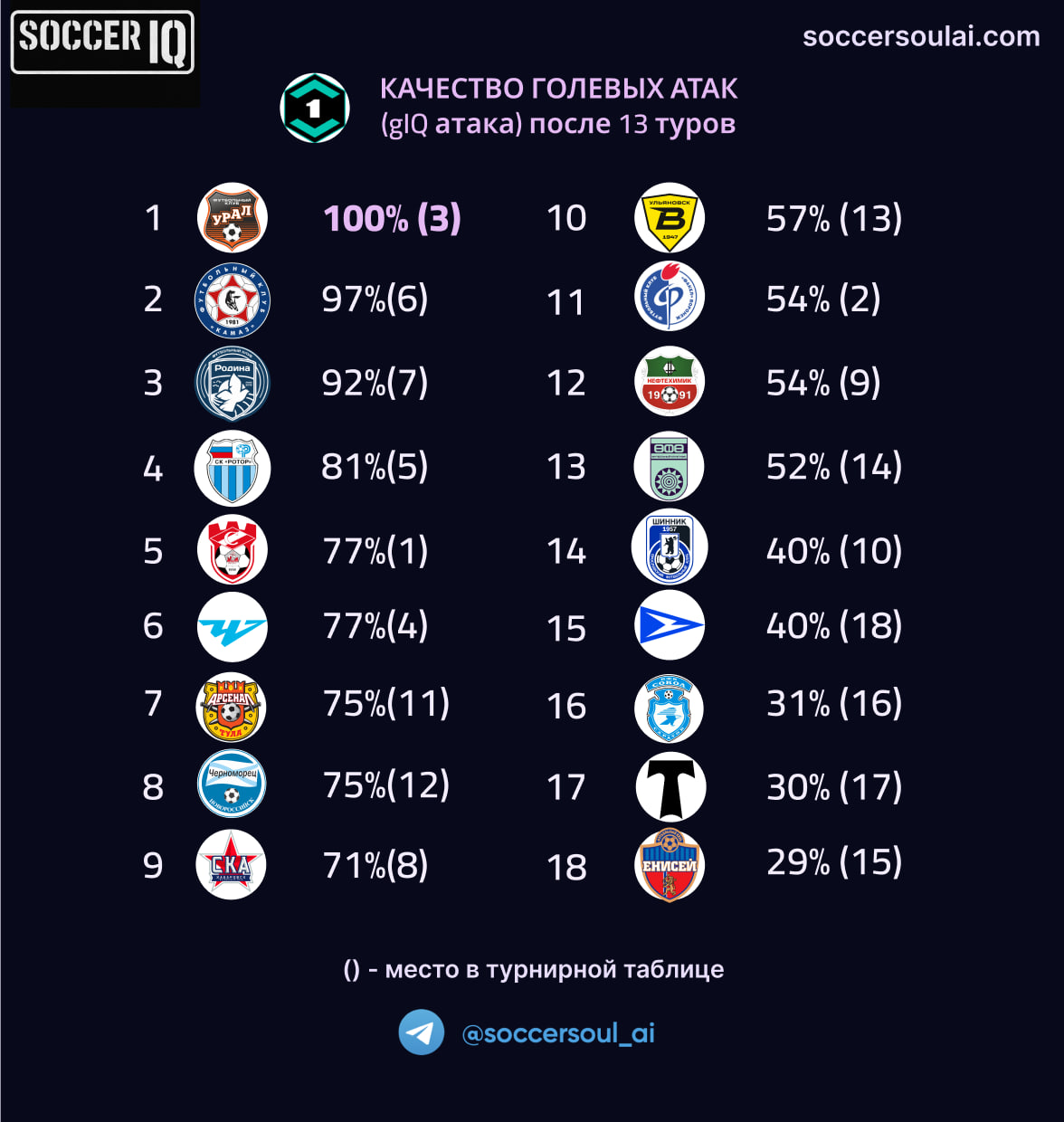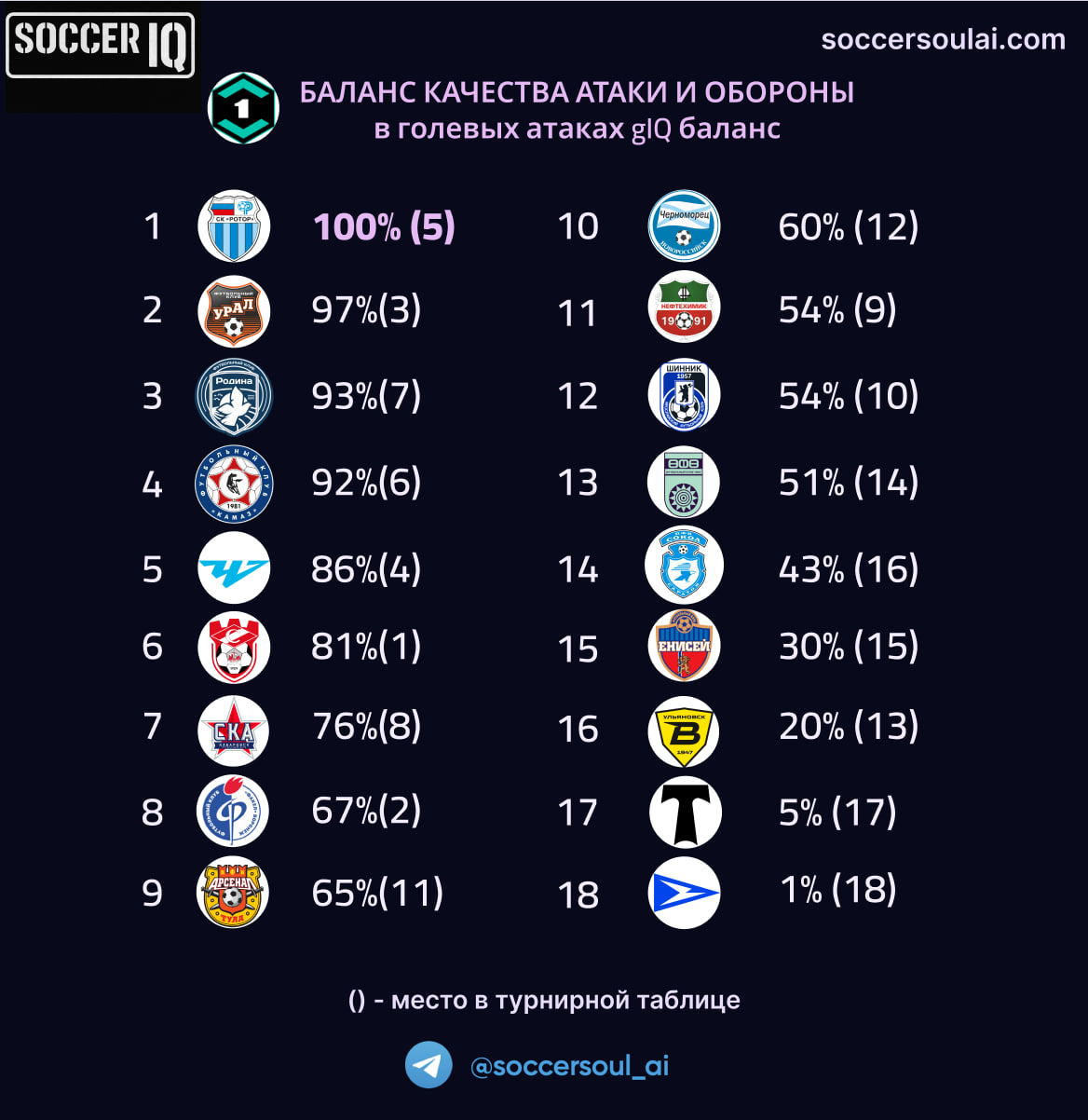 gIQ обороны выявляет слабое место Урала – слишком много предоставляется свободы соперникам, для команды, претендующей на РПЛ. Конечно, есть нюанс – недавние 1-5 от КамАЗа, сильно занизившие оборонительные показатели команды.