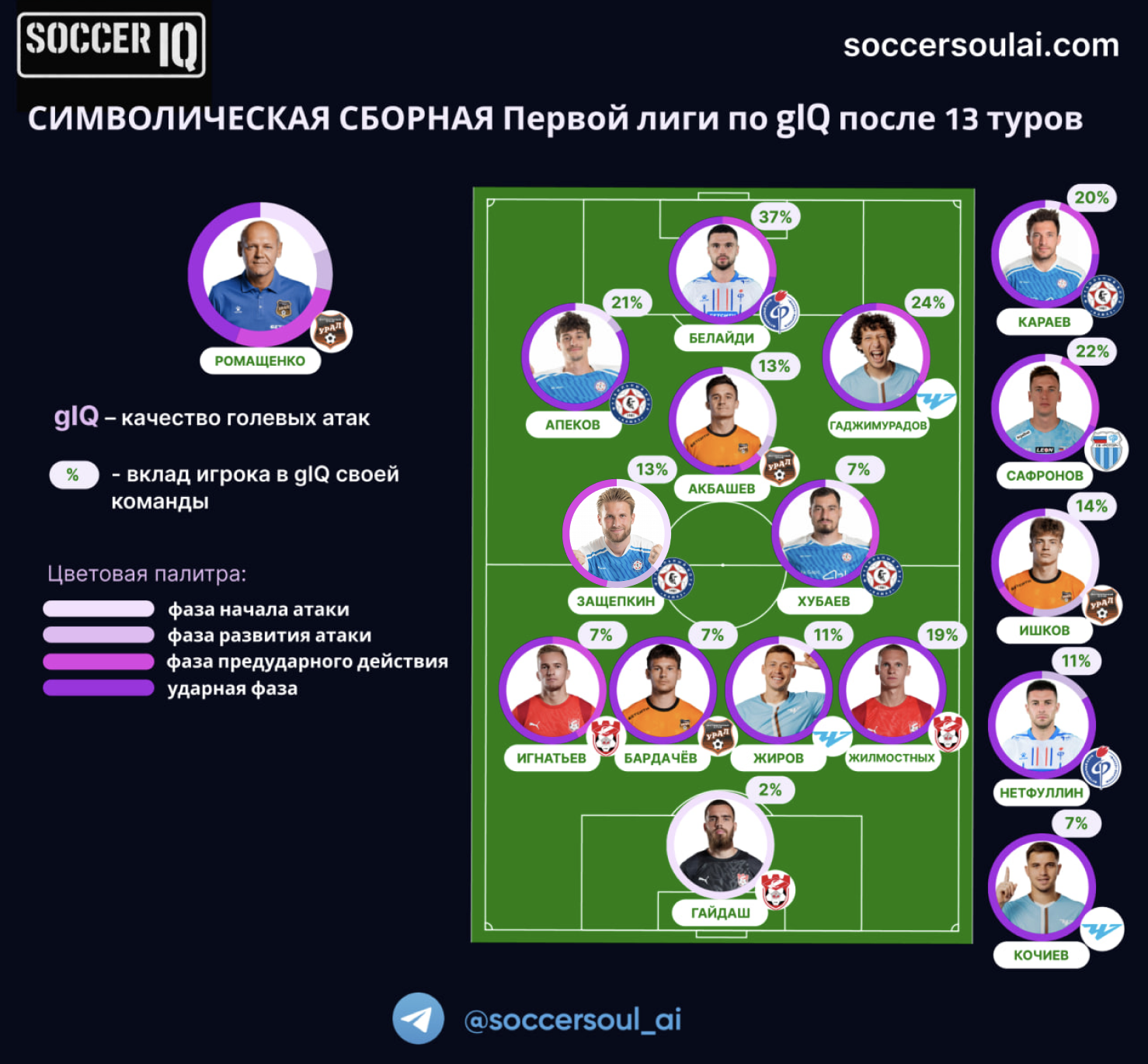 Обратите внимание, что только 3 игрока из 16, которые попали в символическую команду, начинали, развивали голевые атаки, совершали предударное действие и забивали (то есть отметились во всех фазах) — это Защепкин и два представителя Урала Акбашев и Ишков.