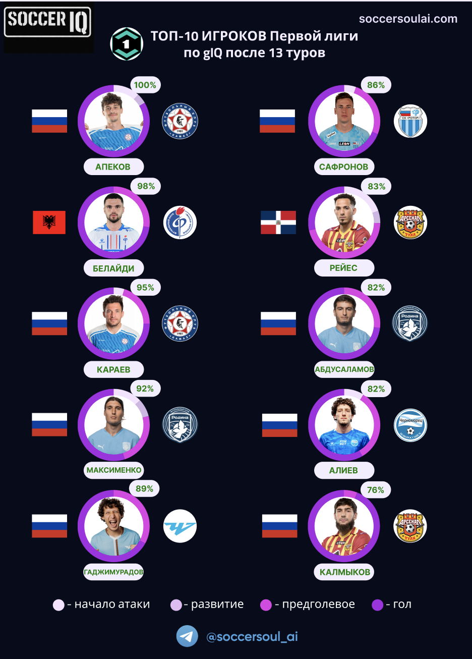 Замыкает ТОП-10 Амур Калмыков – игрок, имеющий в подборке наибольшую долю gIQ в фазе завершения (94%, что отображает цветовая гамма по окружности). Наибольшая доля предголевых действий (голевая передача или предударный финт) на счету Рейес (46%). Он же – лучший с точки зрения доли начала голевых атак (20%)!