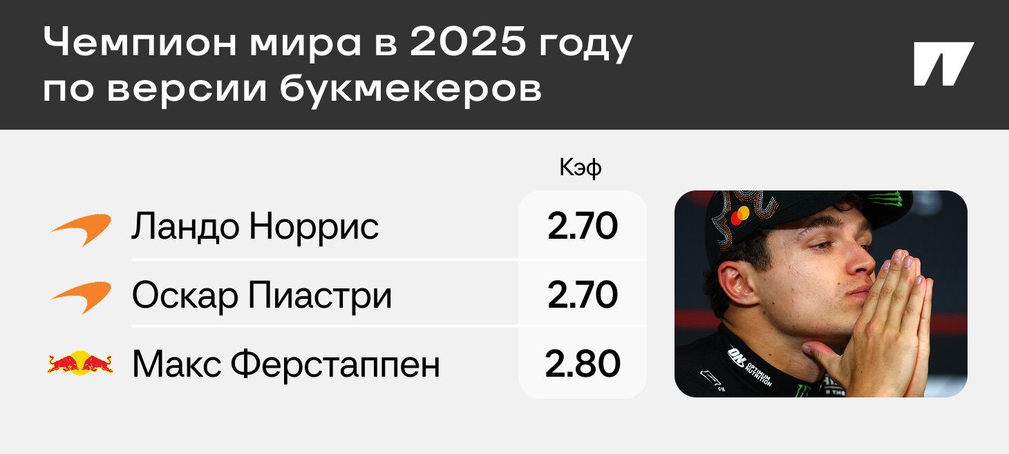 Перед прошлой гонкой двух конкурентов ставили вплотную: 3.00 у Ферстаппена, 3.10 у Ландо Норриса, 3.40 у Оскара Пиастри. Сейчас тройка фаворитов та же, но в Макса верят еще больше, чем тогда.
