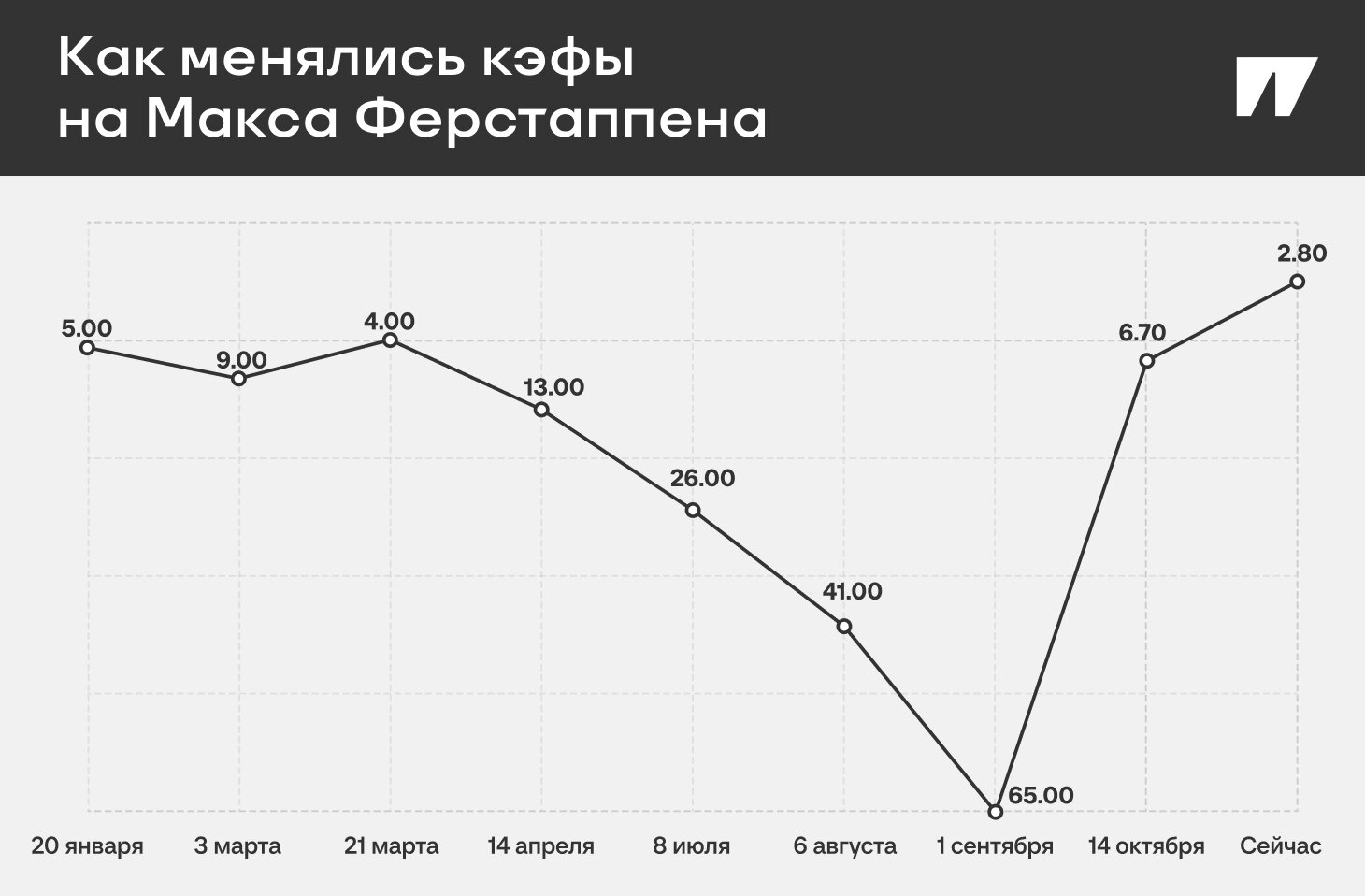 И снова отмечаем феноменальный взлет голландца после серьезного падения. В конце лета и начале осени победа Ферстаппена в чемпионате котировалась на уровне 1-2%. После Сингапура скакнула до 15%. Сейчас он фактически уже наравне с конкурентами. Что за турбулентный сезон!