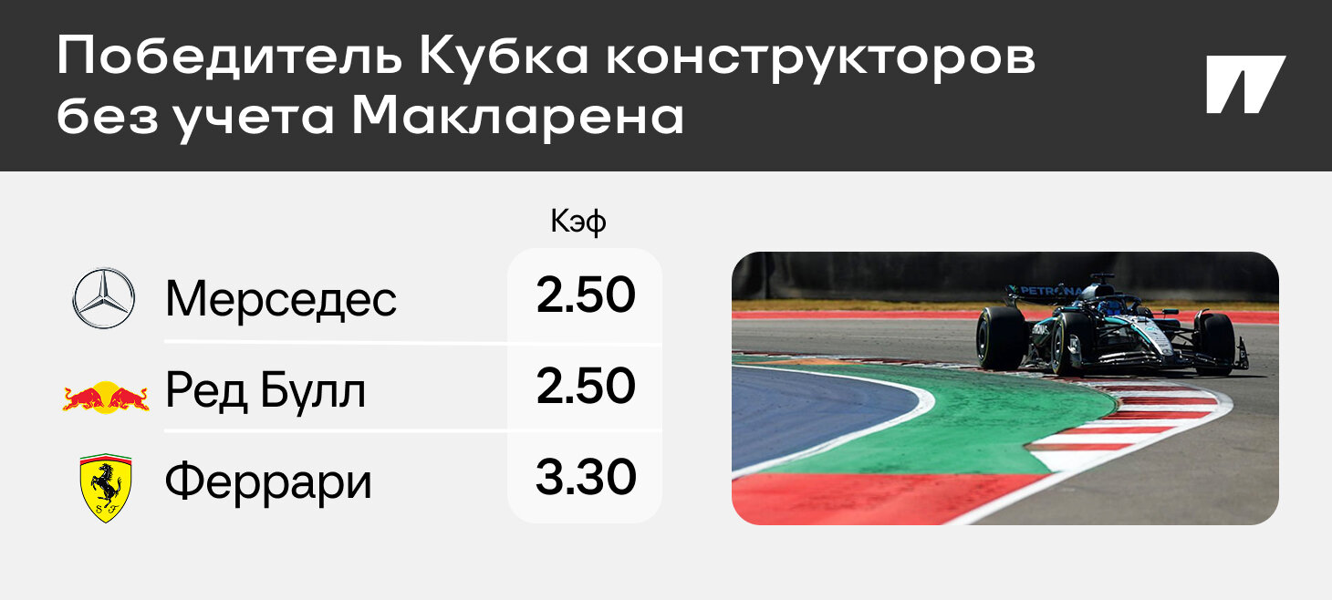 Шарль Леклер спускается все ниже: например, перед сингапурским этапом давали 6.70, перед американским – 15.00, а сейчас уже 17.00. У Джорджа Расселла показатель становится более привычными по сравнению с предыдущим 10.00.