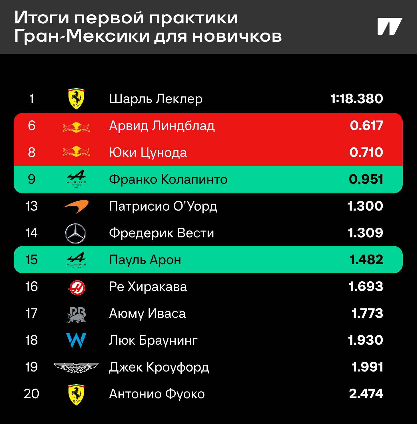 Претендент на место в «Рейсинг Буллз» Арвид Линдблад оказался самым быстрым среди новичков – проиграл лидеру Шарлю Леклеру 0,617 секунды и показал шестое время. Это на 0,093 секунды быстрее, чем у основного пилота «Ред Булл» Юки Цуноды. Японец сражается с британцем и Лиамом Лоусоном за сохранение места на стартовой решетке «Ф-1». Весь вероятно, что в главную команду на место Цуноды перейдет Изак Аджар, а Линдблад станет вторым пилот «РБ».