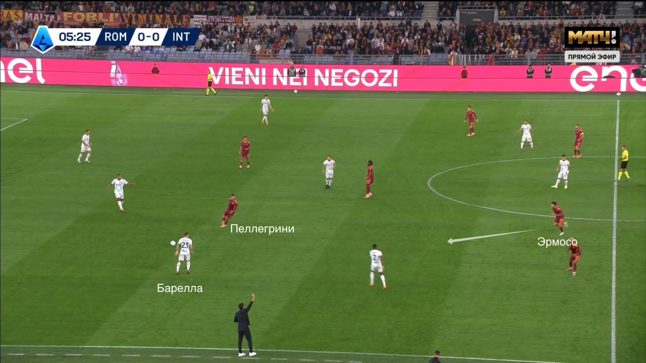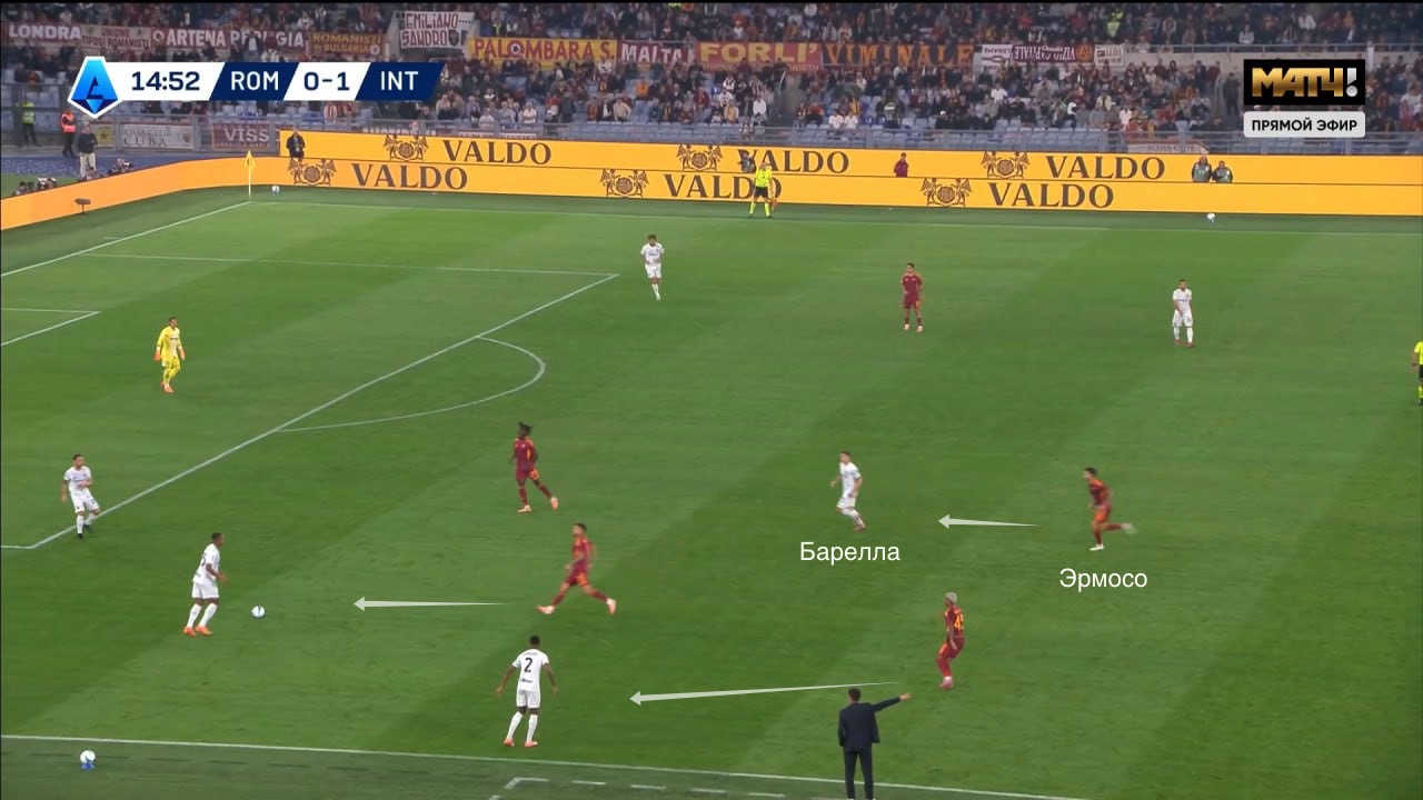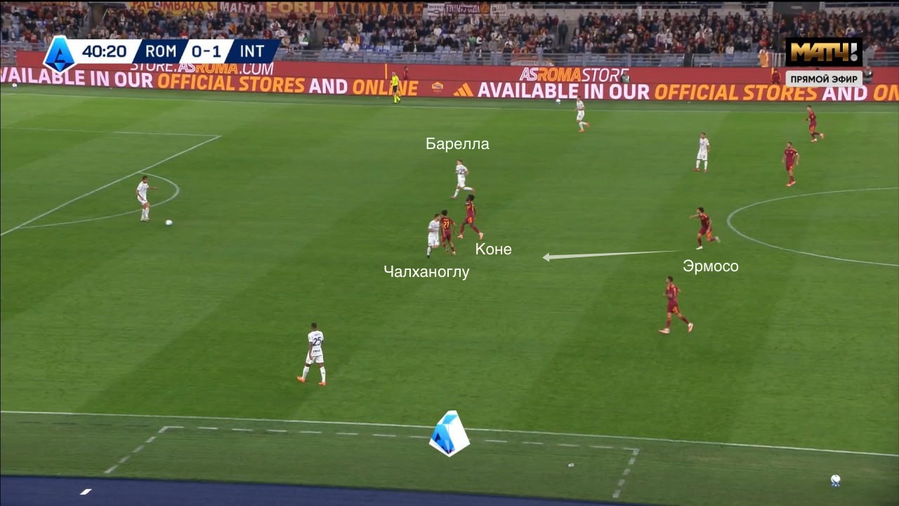 Здесь Марио и Коне сначала запутались, а потом прямо на ходу поменялись полномочиями. Коне перестроился на Бареллу, Эрмосо на Чалханоглу.