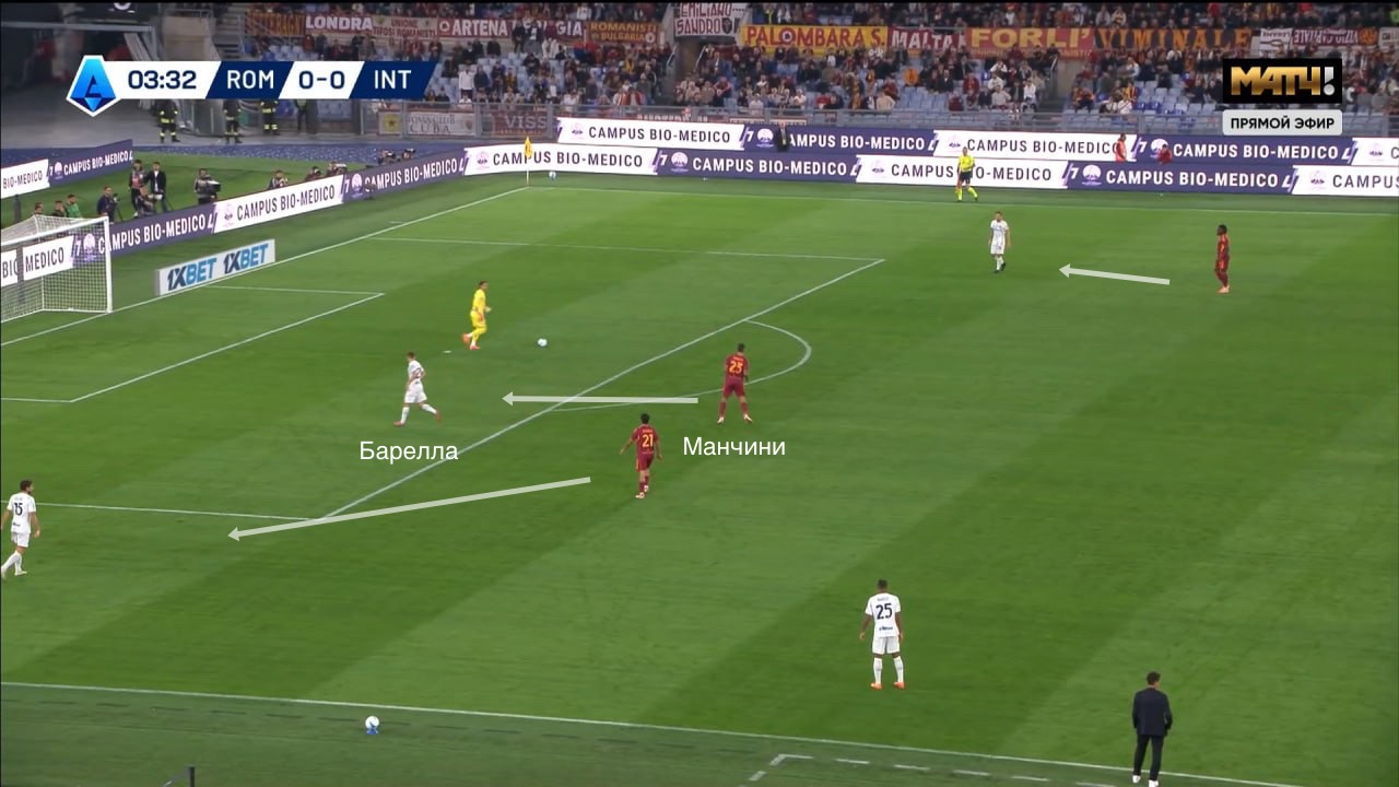 Смотрим. Ага…вырисовывается такой расклад: Дибала играет против Ачерби, Коне – против Чалханоглу, Пеллегрини сторожит Аканжи, а Манчини поднимается вплоть до чужой штрафной, преследуя Бареллу.