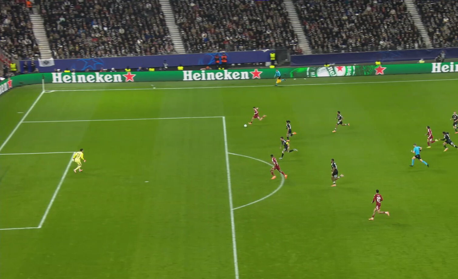 В атаке у «Ливерпуля» тоже какое-то время ничего не получалось, хотя Слот придумал новую конфигурацию: при владении напоминала скорее 3-3-4 – с атакующей четверкой Гакпо-Исак-Экитике-Фримпонг и Флорианом Виртцем под ними. У «Ливерпуля» неплохо получалось зажимать соперника, но распечатать ворота получилось только после контратаки.