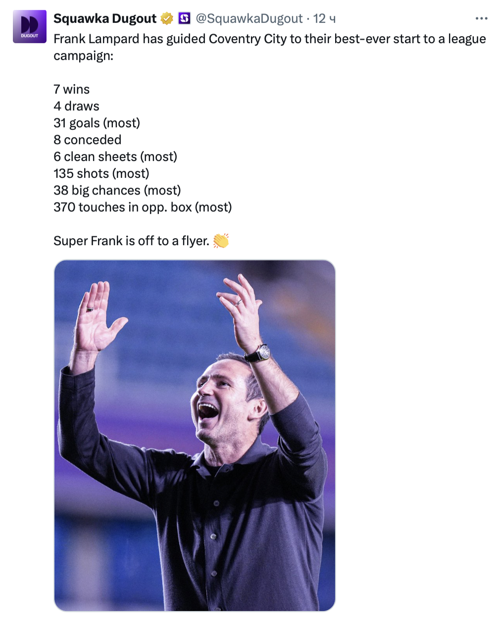 Фрэнк Лэмпард — внезапно главное открытие Чемпионшипа. Его «Ковентри» не просто лидирует после 11 туров — он сметает всех подряд. 25 очков, +23 по разнице мячей, ни одного поражения — лучший старт в истории клуба.