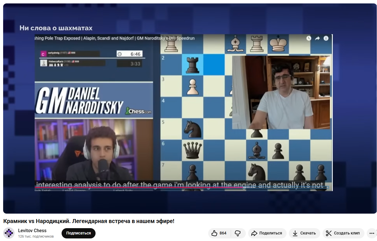 Оба гроссмейстера даже провели «очную ставку» на канале Levitov Chess. Народицкий отвергал все подозрения в свой адрес – как на дебатах, так и на следующих стримах, где подписчики часто спрашивали его о ситуации с Крамником.