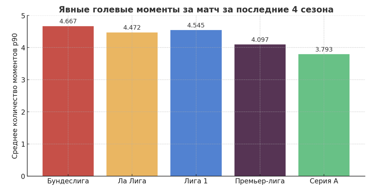 Если взять все те же последние четыре сезона, показатель по явным голевым моментам говорит сам за себя. Серия A — на последнем месте с большим отрывом, что лишь подтверждает трудности (уже отраженные метрикой xG) в создании по-настоящему чистых возможностей для взятия ворот. Премьер-лига, занимающая предпоследнее место, опережает Италию на 0,3 очка за матч — то есть почти на один чистый момент каждые три игры. Этот показатель на дистанции целого сезона и формирует огромный отрыв.