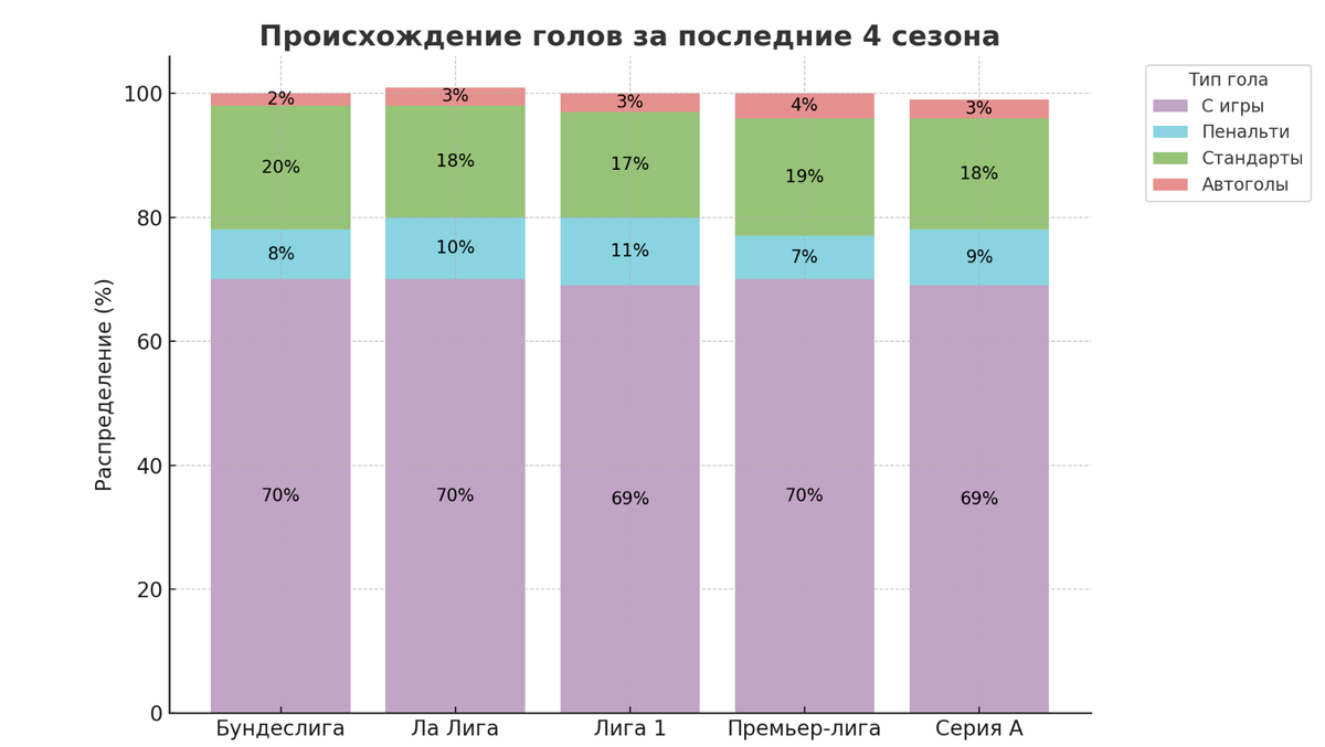 Как видим, существенных различий нет. Распределение действительно очень схоже: основные отличия касаются лишь разброса в пределах 4% по пенальти — от 11% во Франции до 7% в Англии. Слишком мало, чтобы делать из этого какие-то глобальные выводы. Можно было бы ожидать различий по голам с игры, но и здесь показатели почти идентичны во всех лигах — около 70% от общего числа забитых мячей. То же самое касается голов со стандартов и автоголов — никаких резких колебаний. Следовательно, нужно искать причины в другом.