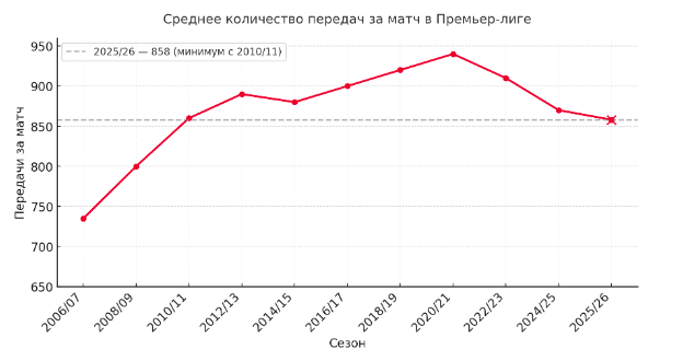 - среднее число передач за матч снизилось до 858 — минимальное значение с 2011 года;