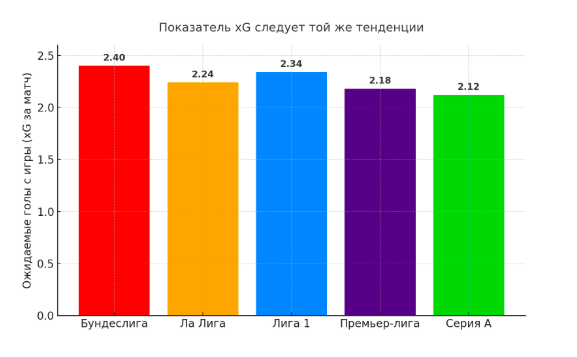 Разница между лигами здесь меньше — что естественно для метрики вроде xG, — но даже она позволяет увидеть общую картину. Серия А вновь замыкает таблицу, подтверждая то, что и без статистики заметно невооруженным глазом: в итальянском чемпионате создание голевых моментов дается с трудом, пусть разница между количеством моментов и количеством реализованных голов не всегда прямо пропорциональна.