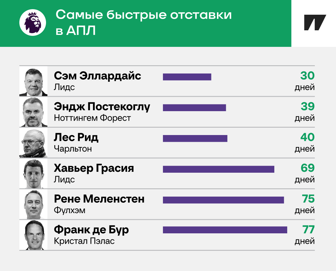 ● Еще одно громкое имя в списке – Франк де Бур. В «Пэлас» голландец приехал в 2017-м – после 85 дней с «Интером». В Англии превзошел себя – хватило на 77 дней. Лондонцы проиграли в чемпионате четыре матча из четырех, не забили ни разу (разница мячей 0:7) – показали худший старт в высшем дивизионе за 93 года. Единственная победа – в Кубке лиги над «Ипсвичем» (2:1) – не убедила никого в тренерском таланте Де Бура. Туда пришел Рой Ходжсон и все пересобрал: поднял команду с 19-го на 11-е место.