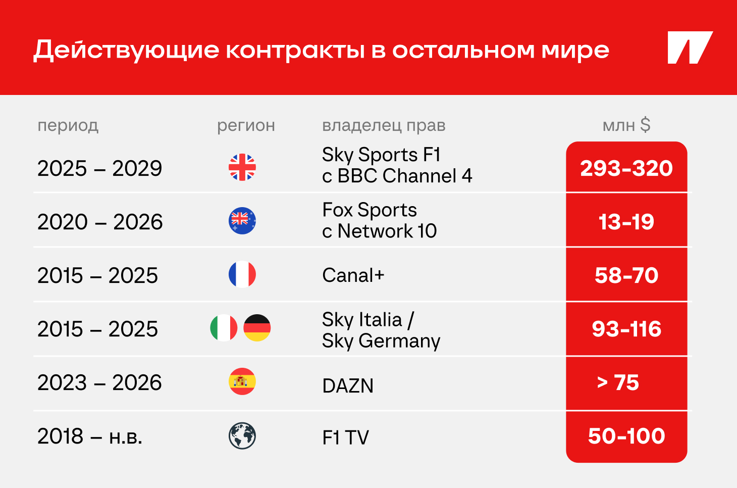 Например, британский Sky Sports с 2012-го показывает «Ф-1» исключительно в Великобритании и продолжит это делать минимум до 2029-го. На BBC Channel 4 показывают гонку на Сильверстоуне и имеют права на обзоры и другой окологоночный контент. По разным оценкам, британцы платят «Ф-1» от 293 до 320 млн долларов за год.