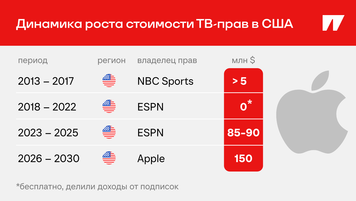 Стоимость сделки оценивают в 150 млн долларов в год – рекорд и серьезное улучшение по сравнению с тем, что последние годы платил ESPN. Динамика роста стоимости ТВ-прав в США впечатляет: за последние пару лет она практически удвоилась, а за 8 лет – увеличилась в 30 раз!