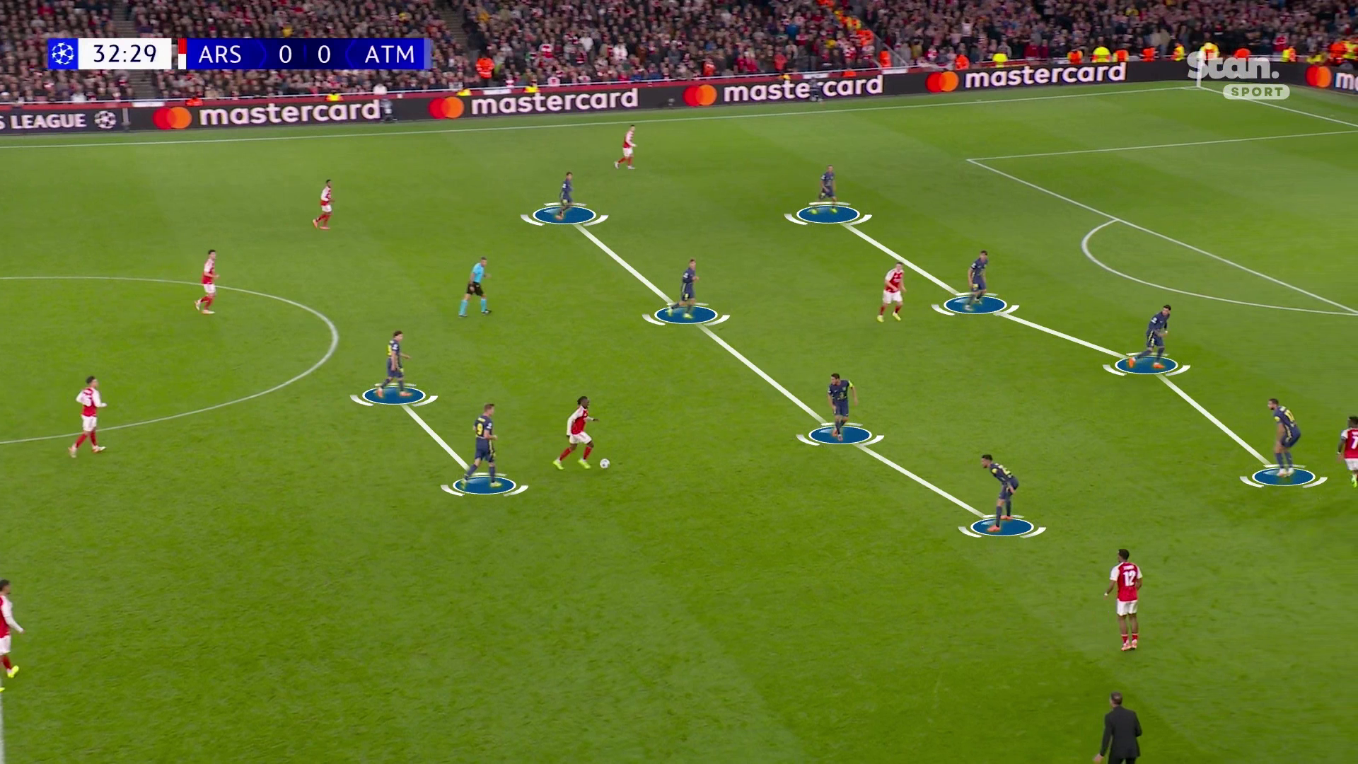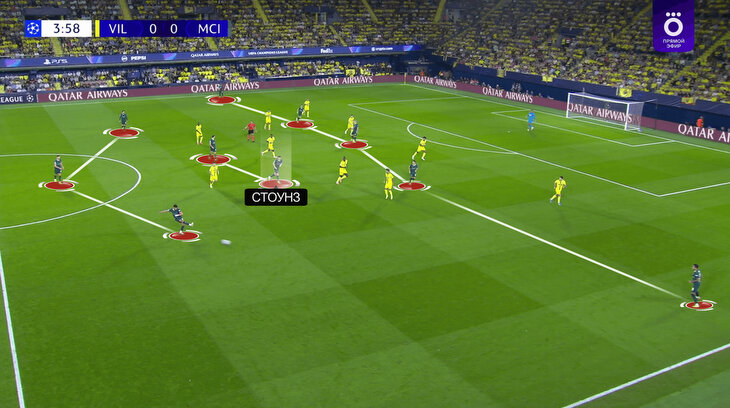 Для тех, кто забыл, напоминание через скриншоты. В стадии игры без мяча Стоунз в классической роли одного из двух центральных защитников: