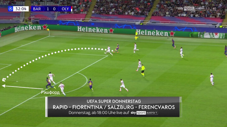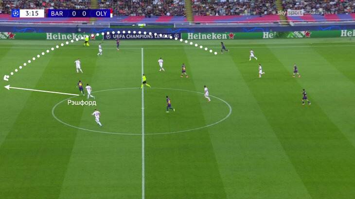 Сначала «Барселона» использовала скорость и часто искала Рэшфорда закидушками за спину. Маркус постоянно искал бреши между защитниками и был готов к передаче. Наиболее опасно получилось в начале игры, когда хозяева преодолели прессинг, и Жюль Кунде увидел движение форварда («Олимпиакос» спас своевременный выход голкипера).