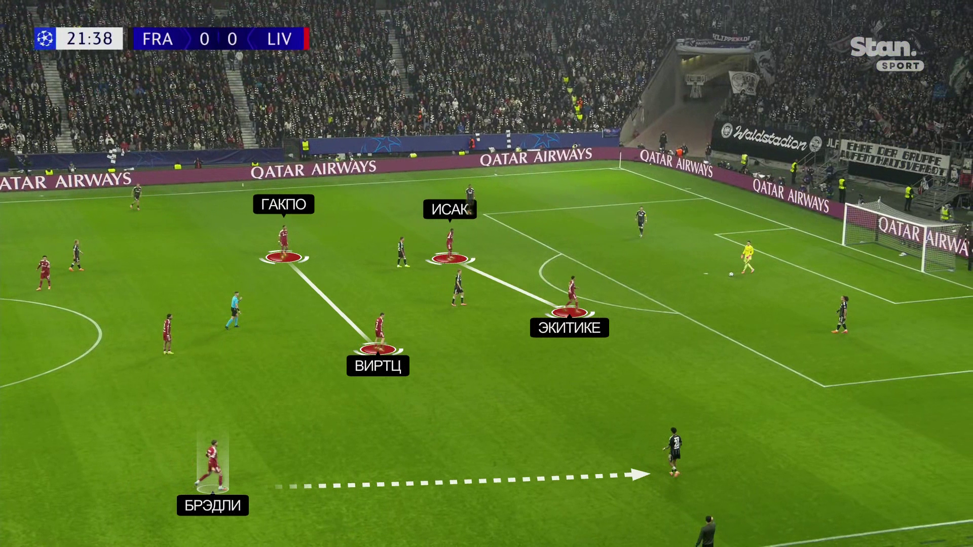 При прессинге формация переходила в 4-2-2-2 с парой форвардов и узкими позициями Виртца и Гакпо. Обязательной была готовность латералей резко поддерживать основную прессинг-группу: