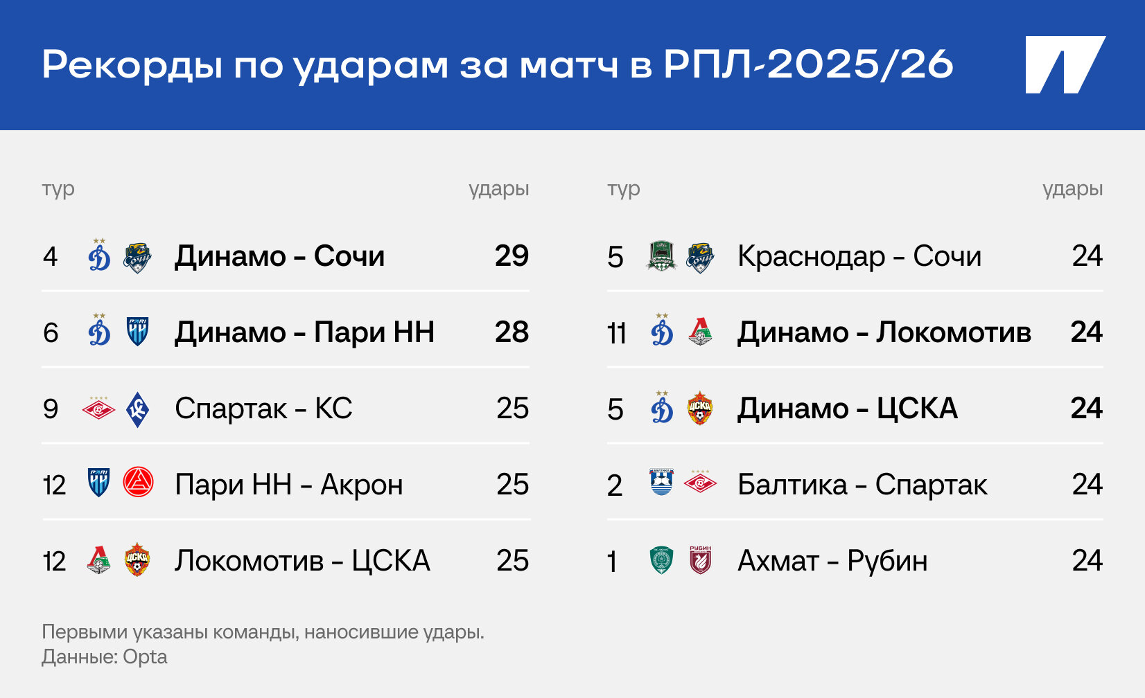 После 12-го тура «Динамо» бьет не то что много, – оно вообще лидирует по ударам за матч (16,6, у «Краснодара» – 16). По xG без пенальти у «Динамо» тоже первое место (1,7 за матч, у «Краснодара» – 1,55). Среди десяти лучших результатов сезона по ударам за матч четыре – динамовские, у других команд в этом списке – не больше одной игры.