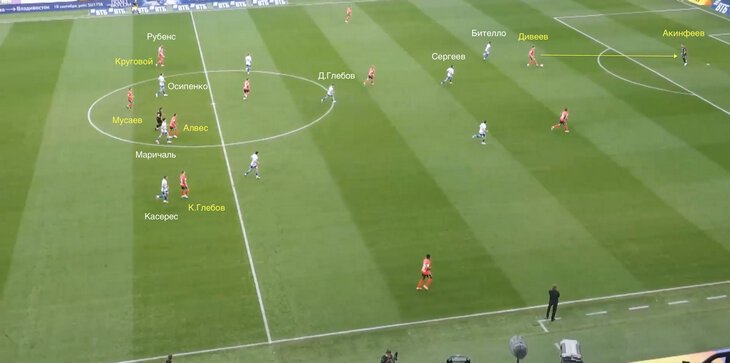 В этот момент четыре атакующих игрока ЦСКА (Круговой, Мусаев, Матеус Алвес, Глебов) находились на центральной линии поля против четырех защитников «Динамо» (Рубенс, Осипенко, Маричаль, Касерес). Игра 1-в-1 – все, как любит Карпин.