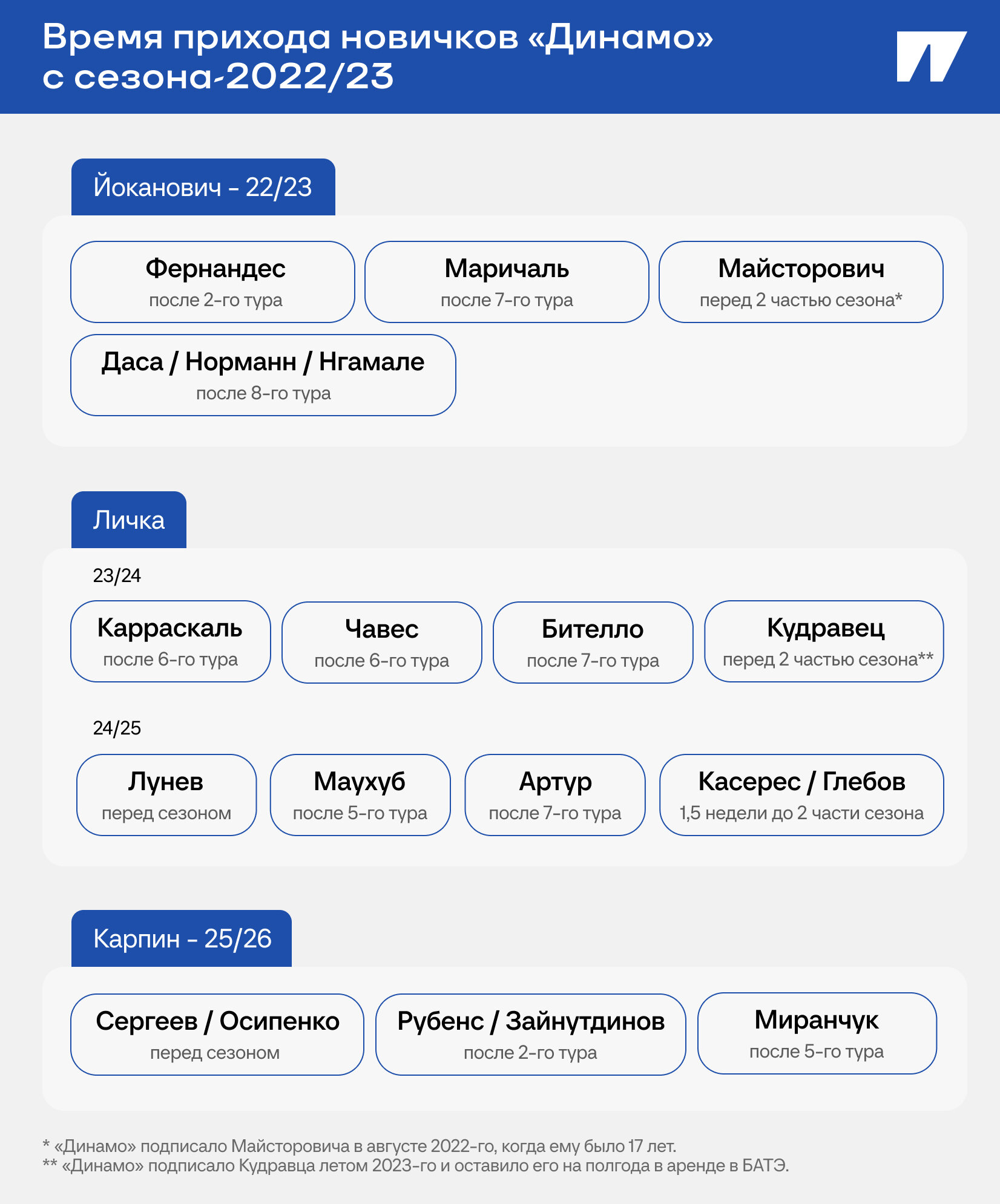 Заявление о почти полностью выполненном летнем трансферном плане в 20-х числах августа – уникальная история для «Динамо» в последние годы. При Славише Йокановиче в 2022-м Муми Нгамале, Эли Даса и Матиас Норманн подъехали только в сентябре, за два сезона Лички лишь один новичок прошел полноценную предсезонку с командой (вратарь Андрей Лунев). В этом году Иван Сергеев и Осипенко приехали до старта сезона, а Зайнутдинов и Рубенс дебютировали уже в третьем туре.