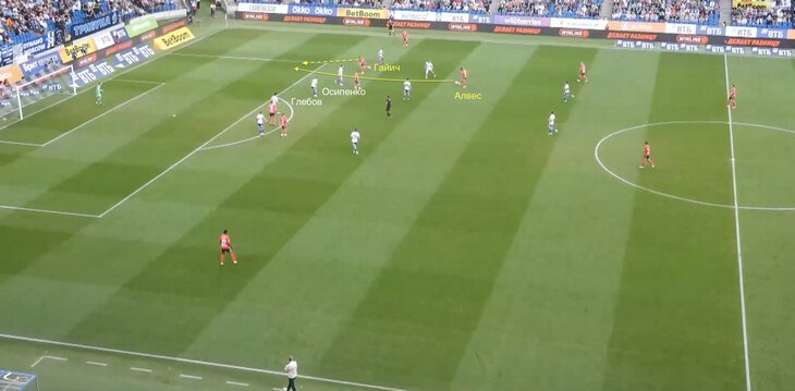 Матеуса Алвеса никто не атакует, и вся оборона «Динамо» смотрит на мяч. Осипенко пропускает включение Милана Гайича за спину.