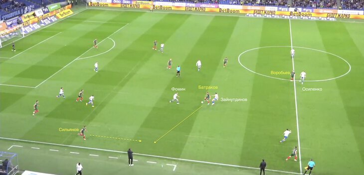 Батраков в два касания отдал пас на Сильянова во фланг – Фомин оказался отыгранным, реагируя на мяч.