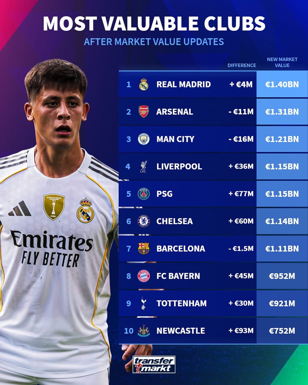 Самым дорогим клубом мира остается «Мадрид», за всех игроков которого придется выложить 1,40 миллиарда евро. «Сливочные» увеличили суммарную стоимость состава лишь на 4 млн евро. Самый большой рост показал Франко Мастантуоно, подорожавший на 20 млн евро, в общем клубном зачете этот результат обнулил Винисиус, который потерял в цене те же 20 млн.