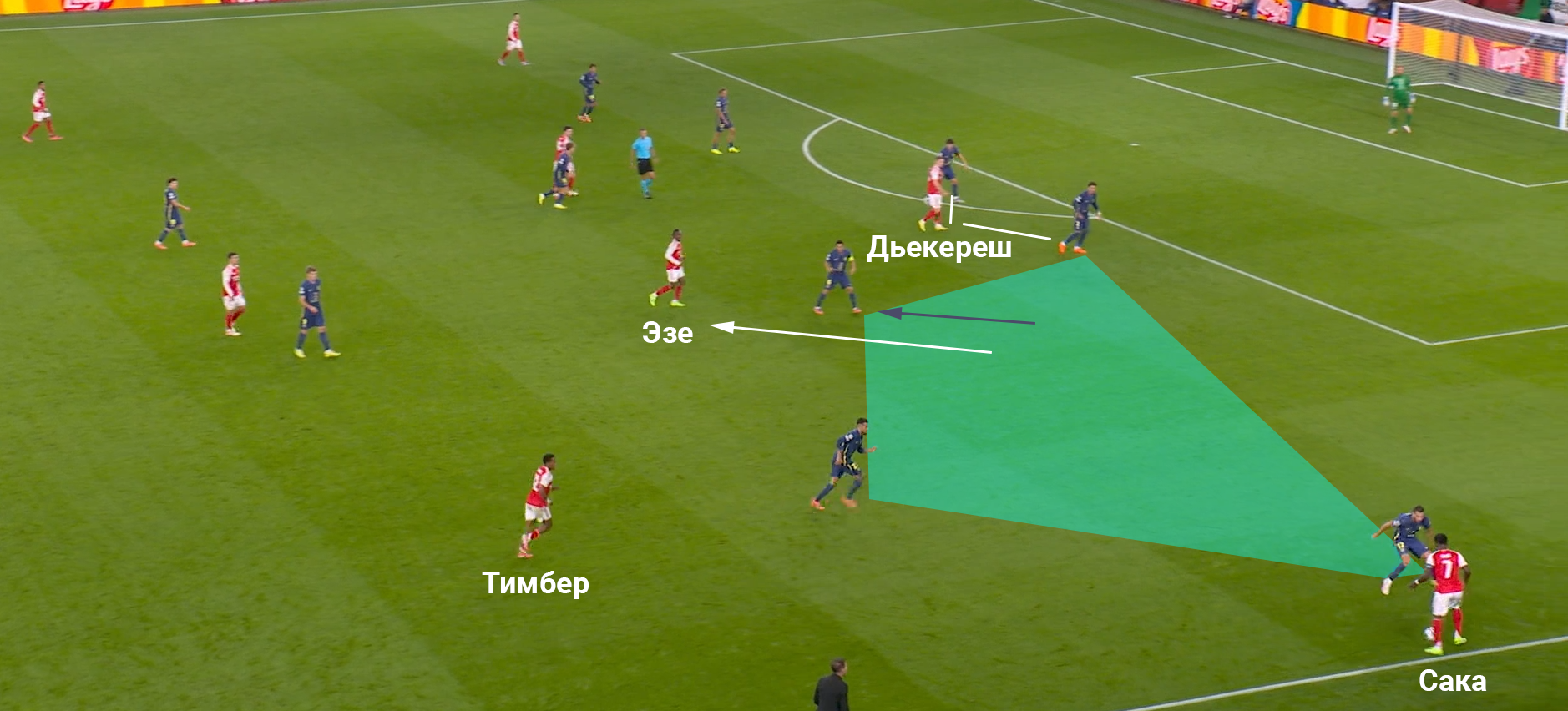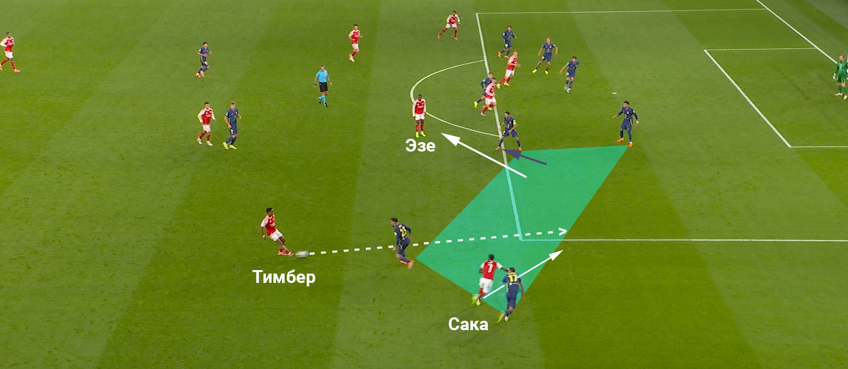 Сака мог выждать забегание Тимбера и наградить передачей партнера по флангу в ответ — классическое взаимодействие кз и вингера на фланге вообщем и целом (шараут Леха Щербаков):