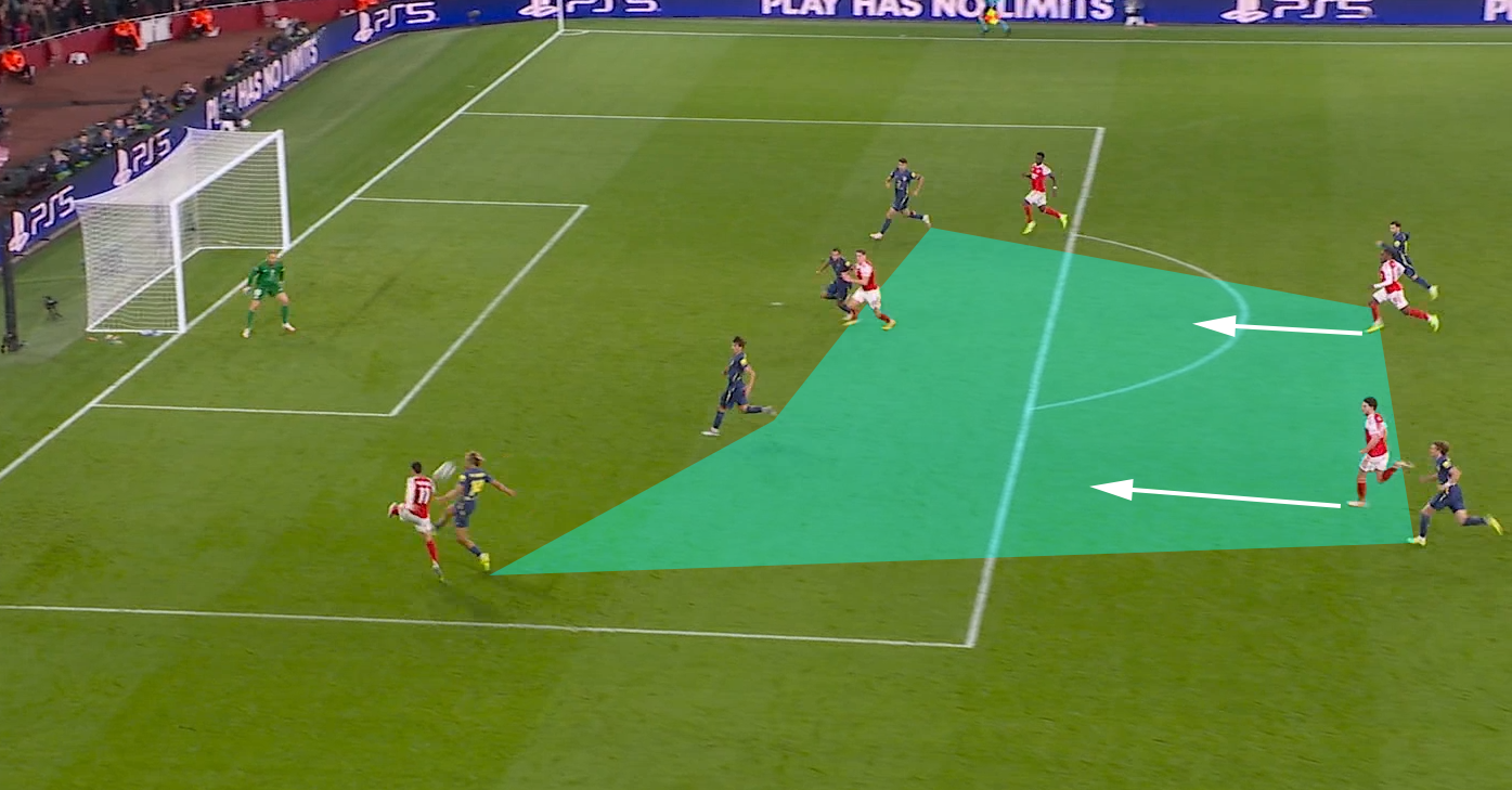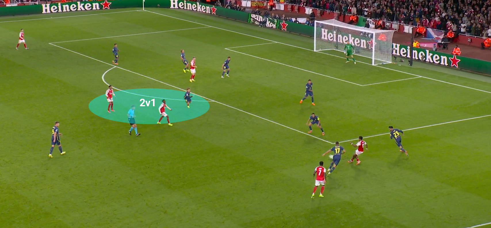 Для того, чтобы продвигать мяч через правый фланг за счет дриблинга Сака, партнеры старались создавать для Букайо удобные ему условия — в частности изолированные ситуации 1v1 c Ганцко.