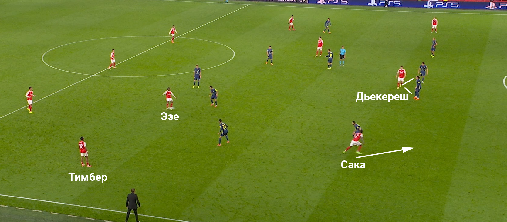 Посадив оборонительный блок «Атлетико» ниже, Букайо можно было не идти в дриблинг, а отрезать его за счет своевременного открывания из ширины внутрь и за счет паса Тимбера: