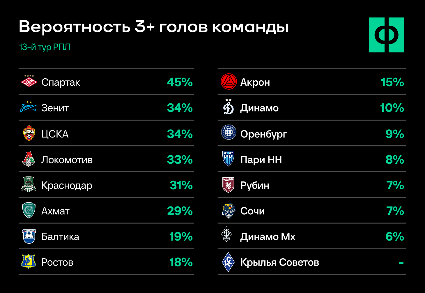● Первый фаворит на гол в 13-м туре – Манфред Угальде. Вероятность выше 50% – редкость для РПЛ. Вернется Жедсон Фернандеш: португалец до травмы забивал три матча подряд.