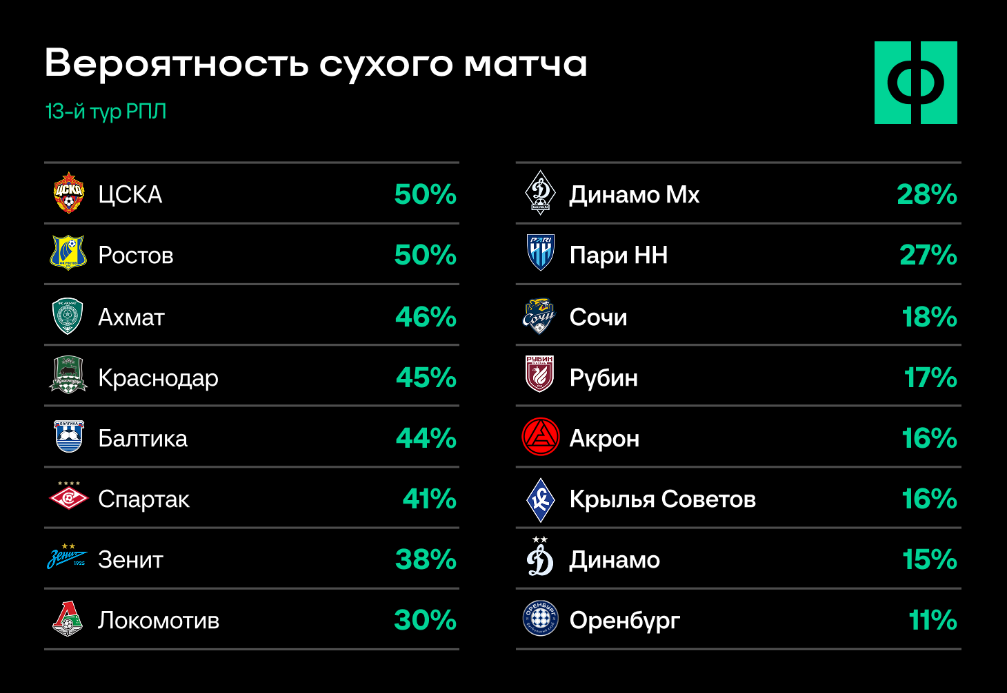 ● «Динамо» и сухарь – вещи в 13-м туре несовместимые. Букмекеры считают, что хуже шансы не пропустить только у «Оренбурга». При этом у «Динамо» пенальтистом остается Максим Осипенко – дилемма для 15% фэнтези-менеджеров, у кого защитник в составе.