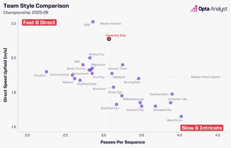 В нынешнем сезоне только «КПР» (2.2 м/с) опережает «Ковентри» (2.1 м/с) по скорости продвижения мяча в атаке. Как видно на следующем графике, команда тратит на перепасовки меньше времени, чем большинство коллективов Чемпионшипа.