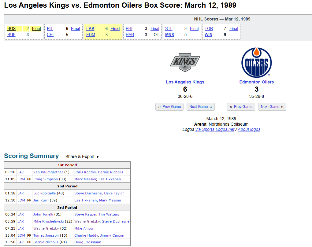 12.03.89. Грец в возрасте 28 лет и 45 дней отметился голом в игре со своим бывшим клубом «Эдмонтон Ойлерз» и довел общее число заброшенных шайб до 635. К слову, спустя месяц Грец во главе ЛАК сотворил грандиозную сенсацию, выбив Эдмонтон из розыгрыша КС в 7 матчах в серии первого раунда. Овечкин в том же самом возрасте 1.11.2013 имел на своем счету 381 шайбу. Итого, 635-381=254. Разрыв достиг исторического максимума.
