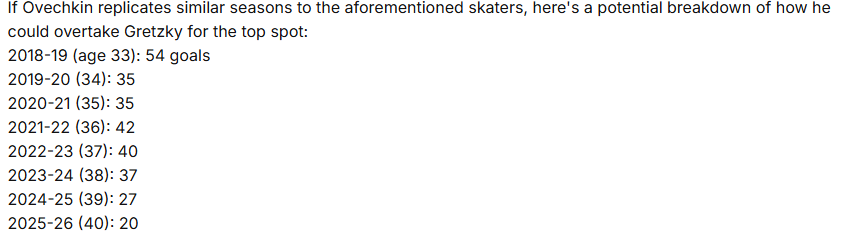 Уэйн Гретцки (26.1.1961) дебютировал в лиге в 18 лет и за первые два сезона забил 106 (51+55) шайб. Овечкин (17.9.85) свой первый матч провел 5.10.2005, когда ему было 20 лет и полмесяца. Уэйн в этом возрасте (в середине февраля 1981 г.) имел на своем счету 83 шайбы. Грец изначально получил солидную фору.