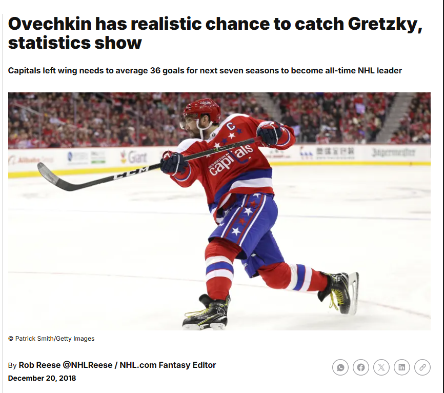 Лет 5-7 назад, когда погоня Овечкина за главным рекордом лиги превратилась в реальную тему, поймал себя на мысли, что если Саня дожмет-таки Греца, то многим этот рекорд покажется весьма уязвимым и недолговечным.