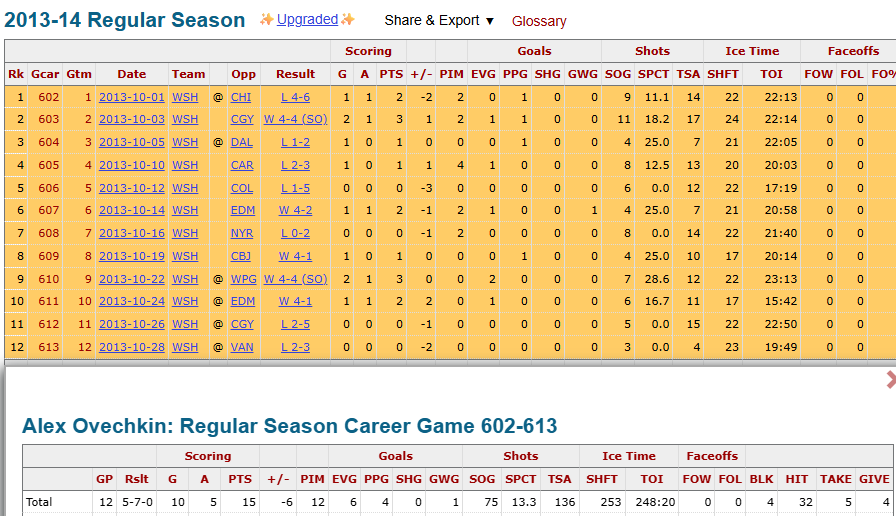 Именно в этот момент и произошел коренной перелом. Но не сразу. В октябре 2013 г. Овечкин забил 10 шайб в 12 играх. Результат отличный, особенно по тем крайне скудным на голы временам. Но Грец в этом возрасте забил 14 шайб за 15 игр!
