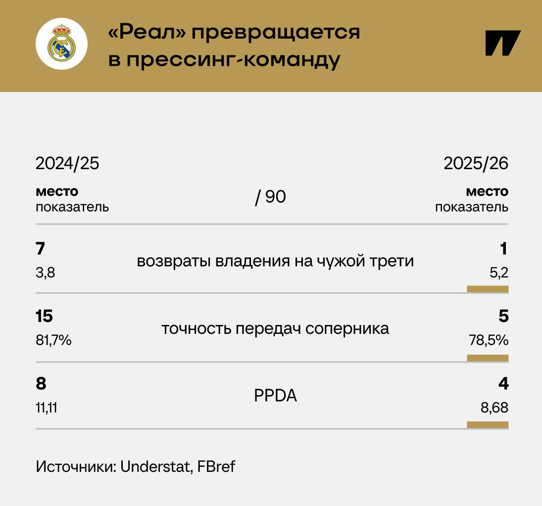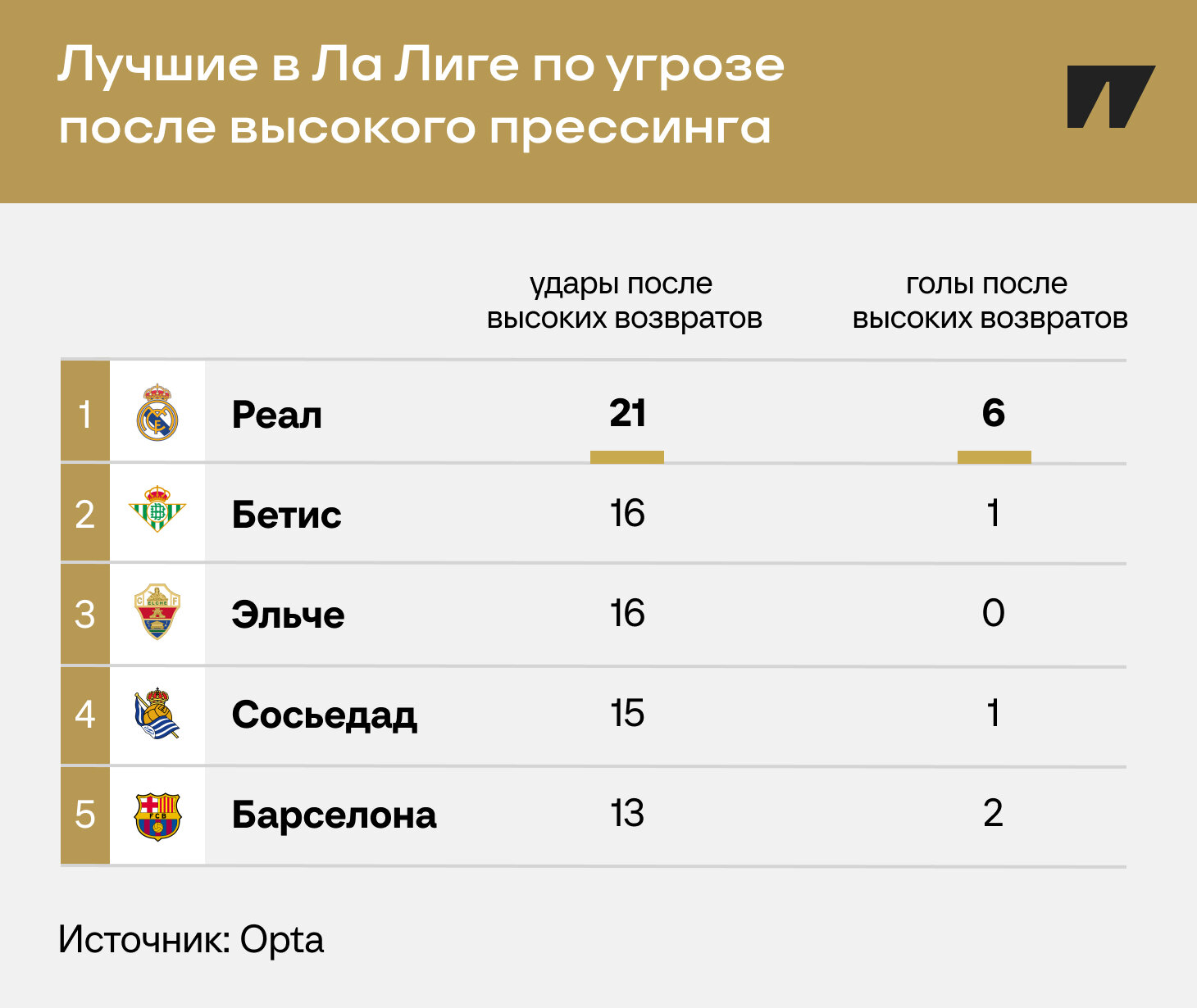 Возможно, дополнительной мотивацией для суперзвезд служит возможность получать бонусные моменты из прессинга. В умении трансформировать высокое давление в моменты «Реал» – с запасом лучший в Ла Лиге: