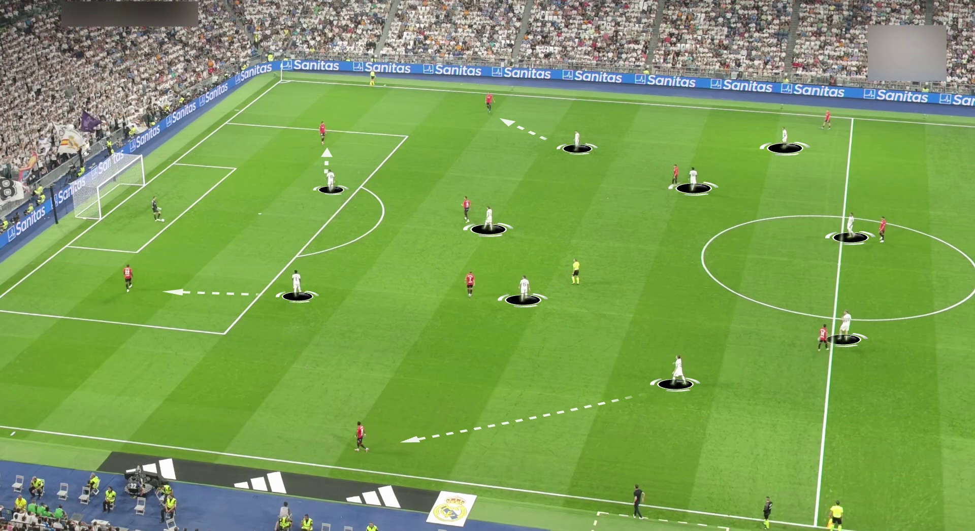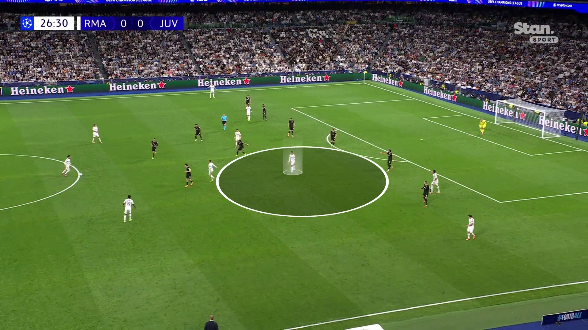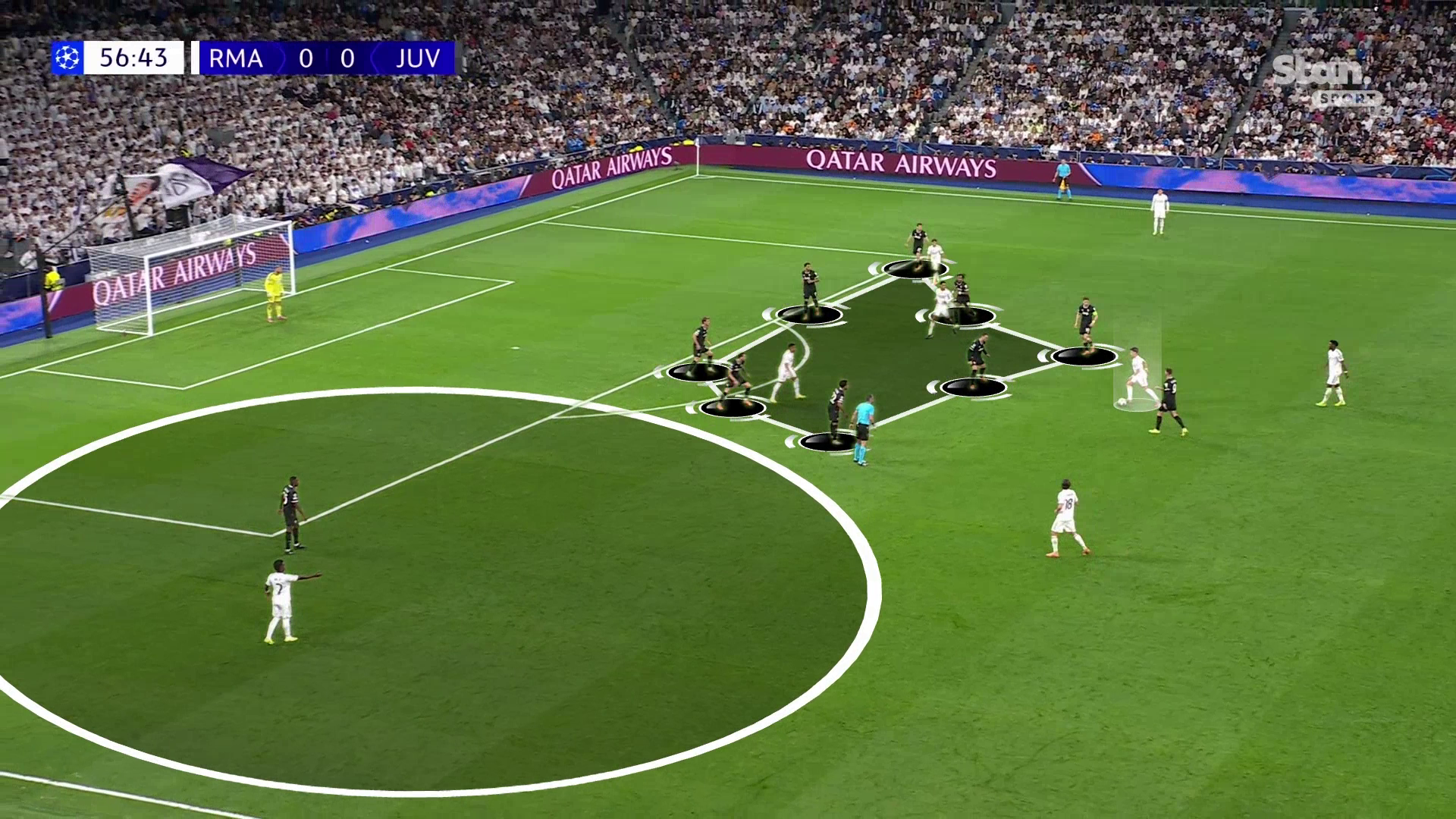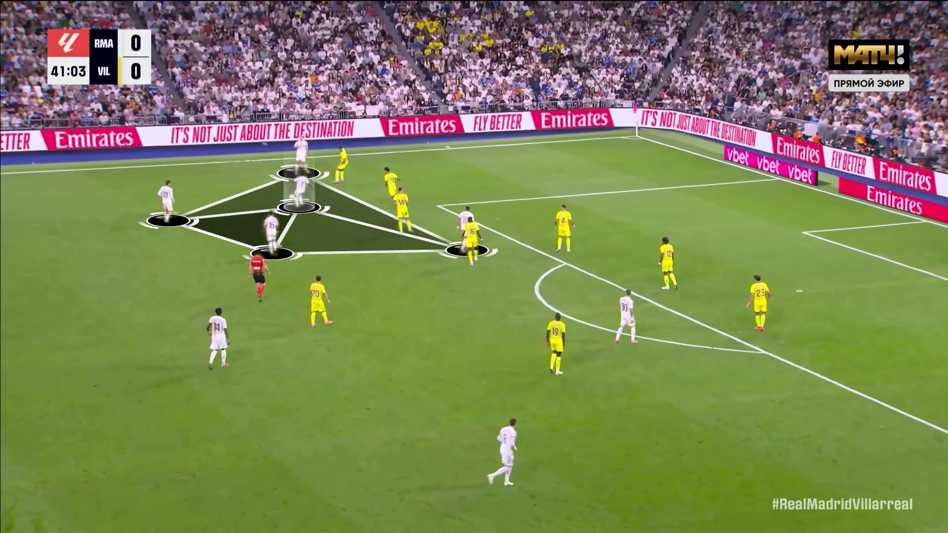 А вот ситуация, где соперник излишне сузился, в таком случае выгодным становится продолжение через фланг. Там Вини может либо порвать 1-в-1, либо дождаться создания перегруза для комбинации: