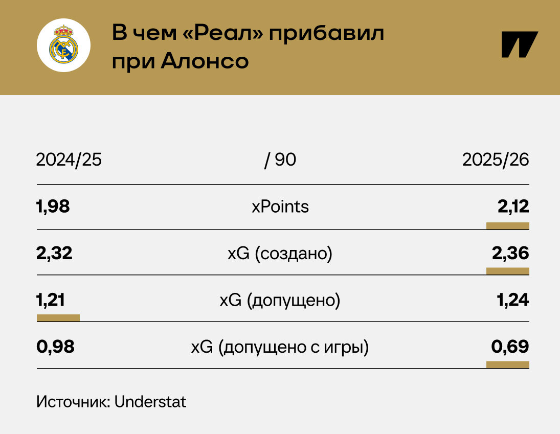 Давайте сравним «Реал» с прошлым сезоном по самым базовым показателям. Даже такое сравнение кое-что расскажет об акцентах в работе Алонсо: