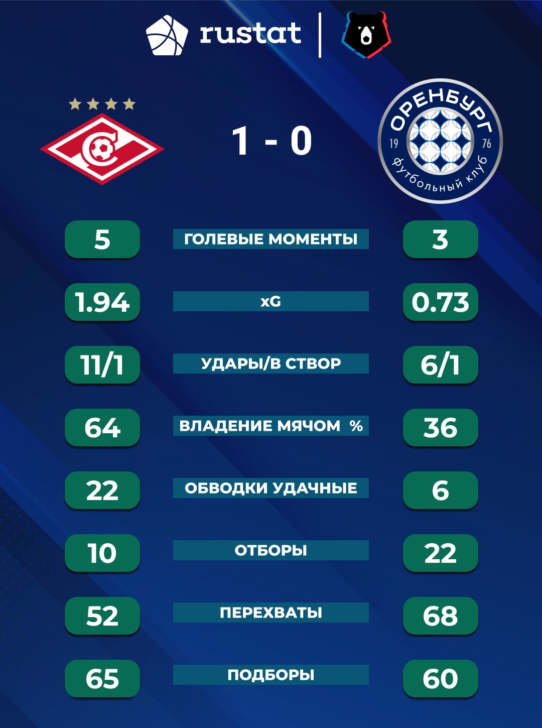 Портал Рустат предоставил статистику матча. По атакующим показателям (опасные моменты, xG, Удары) Спартак имел преимущество, но уступал в оборонительных показателях (отборы, перехваты).