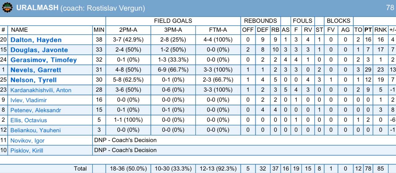 Гарретт Нэвелс провел лучшую игру в сезоне. В 3 четверти американец набрал 14 очков из 20 командных. Всего на счету разыгрывающего 29 очков (4 из 8 – двухочковые, 6 из 9 – трехочковые, 3 из 3 – штрафные), 2 подбора (1 на чужом щите), 3 передачи, 2 перехвата при 3 потерях.
