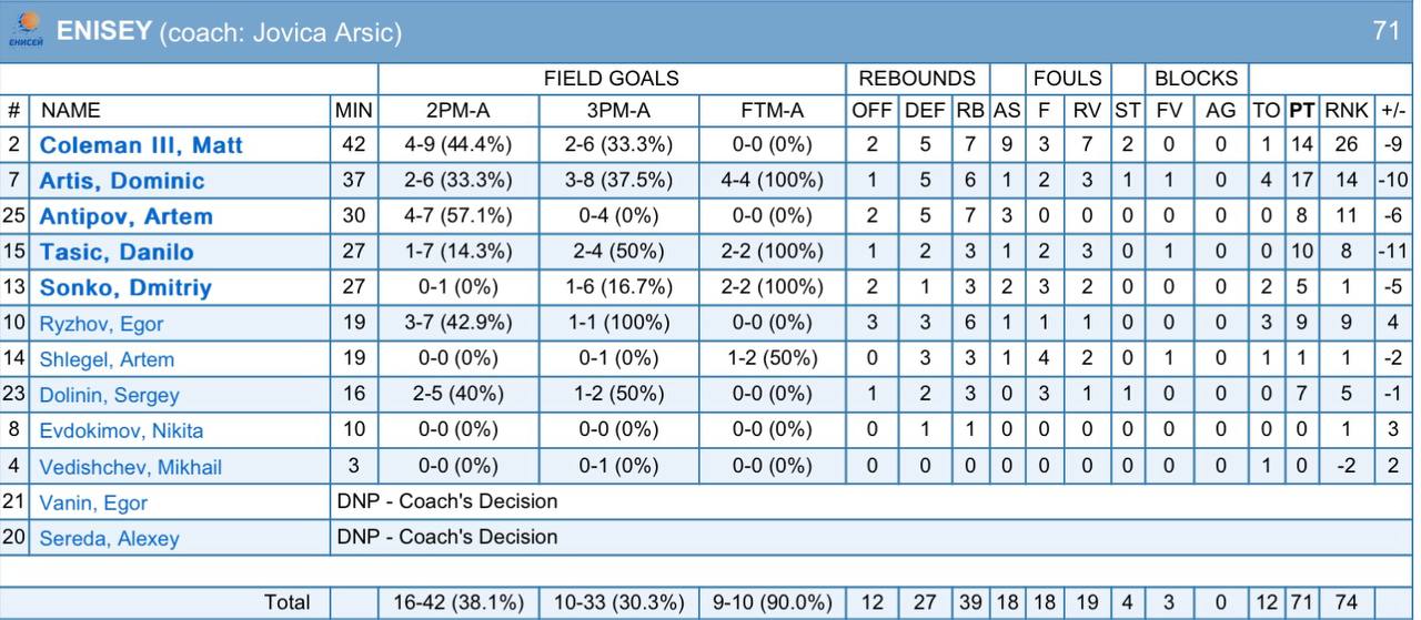 Игроки «Енисея» хорошо играли в защите, что подтверждают 3 блокшота красноярцев в первой 10-минутке. Сначала Артем Шлегель заблокировал Далтона, а затем Тасич – Тайрэлла Нэльсона. После этого последовал быстрый отрыв от Мэтта Коулмэна и его дальнее попадание. Обе команды испытывали проблемы с игрой в атаке. Следующие очки набрал Егор Рыжов. После промаха Артема Антипова центровой «львов» добил мяч сверху. В ответной атаке Карданахишвили все-таки набрал 3 очка, но не с помощью дальнего попадания, а забив с фолом. После этого последовал обмен удачными атаками и набранными очками. Отмечу Гарретта Нэвелса, который дважды попал из-за дуги. В концовке 10-минутки он пытался набрать еще 2 очка, но был заблокирован Домиником Артисом.