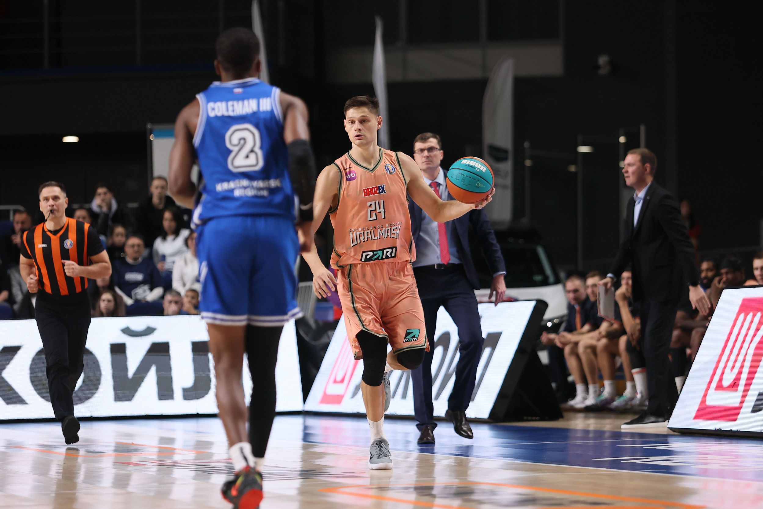 В стартовой четверти красноярцы ни разу не потеряли мяч. Во второй для них все началось с потери Михаила Ведищева, но это не помешало им совершить мини-рывок 5:0. Артис попал из-за дуги, а Рыжов добавил 2 очка из-под кольца. Тайм-аут «Уралмаша» немного привел в чувство гостей, и после минутной паузы Далтон реализовал 3-очковый. Однако уральцы допускали очень много глупых потерь. То заступят за линию, то пробежка.