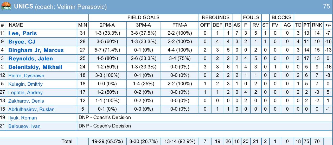 УНИКС проиграл каждую четверть. Но важно, что везде разрыв был небольшим. Казанцы допустили 18 потерь и показали ужасную реализацию из-за дуги – 8 из 30. Провал в конце 2-й и начале 3-й четверти предопределил результат игры. Это первая настоящая проверка для подопечных Велимира Перасовича, и они смотрелись достойно. Главное, чтобы были сделаны правильные выводы.