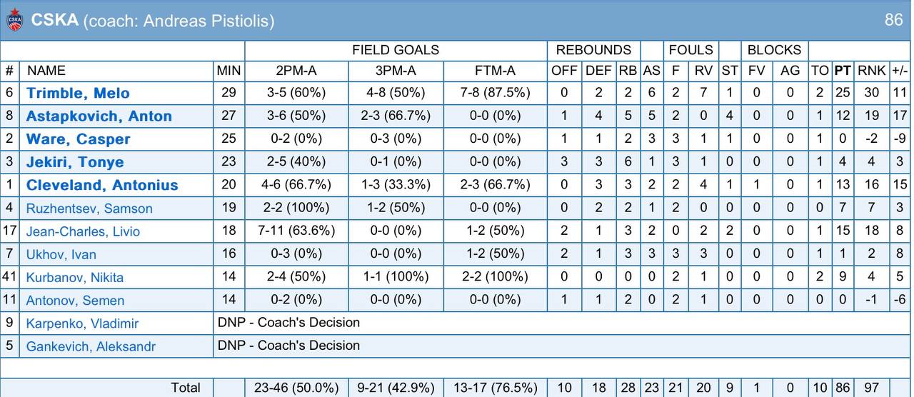 Мело Тримбл провел лучший матч в сезоне. Американец набрал 25 очков (3 из 5 – двухочковые, 4 из 8 – трехочковые, 7 из 8 – штрафные), 2 подбора, 6 передач и 1 перехват при 2 потерях.