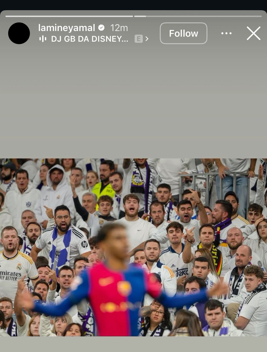 Теперь Ямаль выложил новое фото — на заднем плане видно недовольных фанатов «Реала». Прямо перед класико.